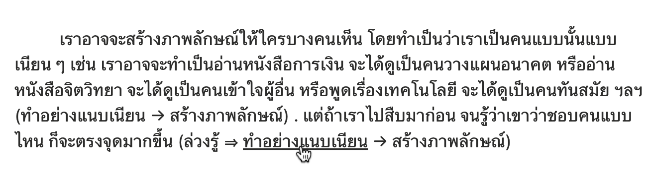 เราอาจจะสร้างภาพลักษณ์ให้ใครบางคนเห็น โดยทำเป็นว่าเราเป็นคนแบบนั้นแบบเนียน ๆ เช่น เราอาจจะทำเป็นอ่านหนังสือการเงิน จะได้ดูเป็นคนวางแผนอนาคต หรืออ่านหนังสือจิตวิทยา จะได้ดูเป็นคนเข้าใจผู้อื่น หรือพูดเรื่องเทคโนโลยี จะได้ดูเป็นคนทันสมัย ฯลฯ(ทำอย่างแนบเนียน → สร้างภาพลักษณ์) . แต่ถ้าเราไปสืบมาก่อน จนรู้ว่าเขาว่าชอบคนแบบไหน ก็จะตรงจุดมากขึ้น (ล่วงรู้ ⇒ ทำอย่างแนบเนียน → สร้างภาพลักษณ์) . อ่านว่า “ล่วงรู้ แล้วทำอย่างแนบเนียน เพื่อสร้างภาพลักษณ์”